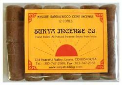 Sandalwood Incense Cones: From Surya Incense come these true Sandalwood incense cones made from only the finest Mysore State India Sandalwood. Enjoy true and authentic incense burning, without that sticky-sweet scent that plagues most mass-market incense cones. Each package contains 12 cones .Mountain Rose Herbs